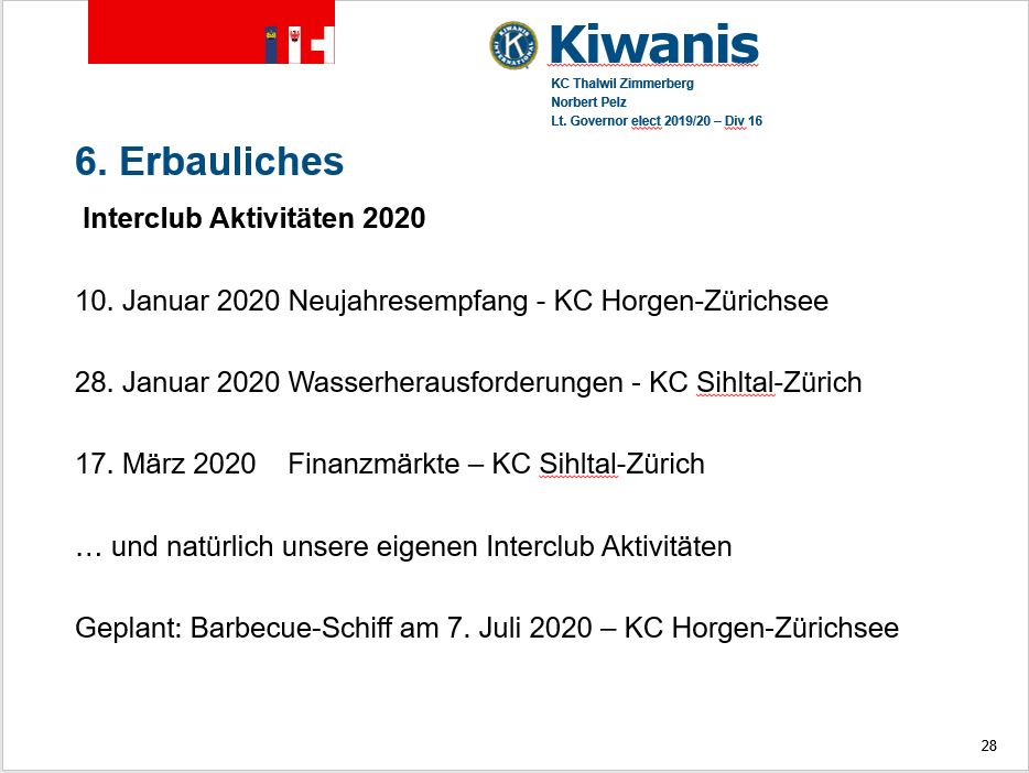 Liebe Alle Gerne lade ich Euch zum nächsten Club-Meeting ein, das wie üblich im Restaurant Etzliberg stattfindet. In offizieller Mission wird uns der neue Ltd. Govrnor Norbert Pelz besuchen und über Neues und Geplantes des Distrikts und der Division berichten. Nun wünsche ich Euch allen einen guten Start in ein glückliches, gesundes und erfolgreiches 2020 ! Herzlichst Gisela |